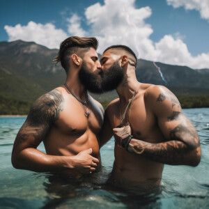 «The image depicts two shirtless men with beards, kissing, standi...»