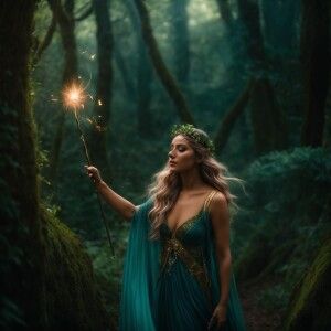 «An elegant elven woman gracefully wanders through a lush and enc...»