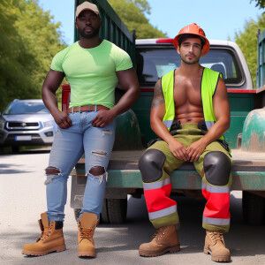 «The image depicts a muscular man bearded hairy chest beefy stand...»