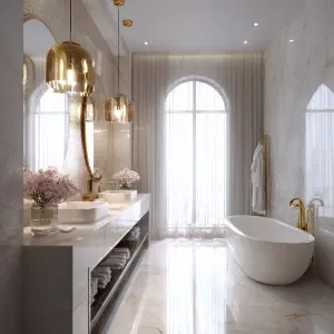 «Create a captivating image of a luxurious Scandinavian bathroom...»