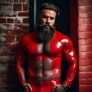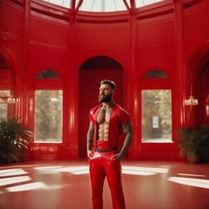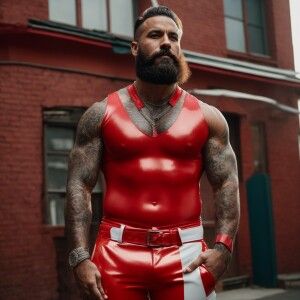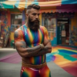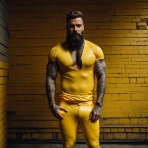 «A bearded, muscular man confidently stands with his hands in his...»