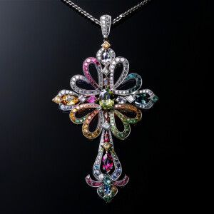 «Design an elegant and intricate cross pendant adorned with color...»
