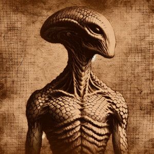 «Describe a 20-foot tall alien with scaly skin.»