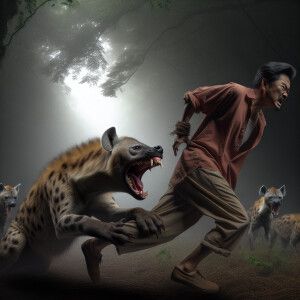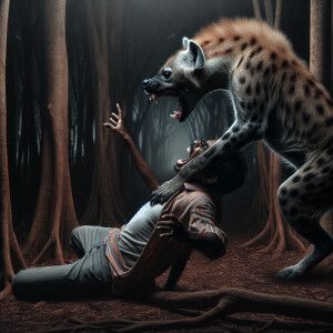 «ضبع شرس يقبض بفكه المفترس على رأس انسان ويحاول جره الى الغابة ال...»