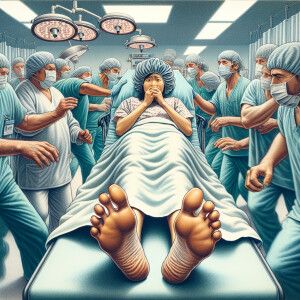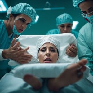 «34 year old panicked Spanish woman wearing surgical bouffant cap...»