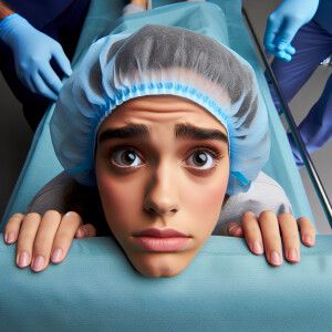 «23 year old panicked Spanish woman wearing surgical bouffant cap...»