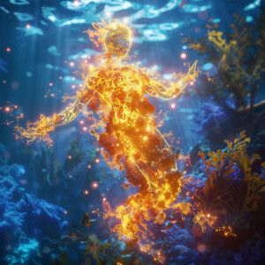 «Create a dynamic scene of sea moss glowing underwater, emitting...»