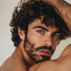 «The image showcases a close-up of the upper torso of a man with...»
