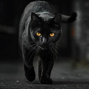 «A beautiful black cat walking towards the camera»