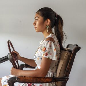 «A cute Mexican woman sitting in a wooden chair