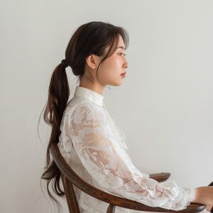 «A cute asian woman sitting in a wooden chair