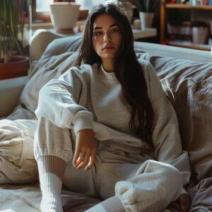 «Photo of fair skinned hourglass figure woman with dark straight...»