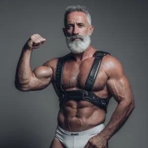«A muscular, mature man with a thick gray beard poses confidently...»