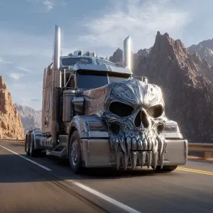 «"A highly detailed, chrome-plated semi-truck with a menacing sku...»