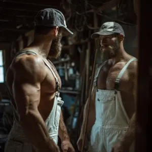 «Generate an image of a muscular and hairy handyman without a shi...»