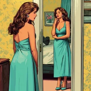 «A 40-year-old suburban housewife is standing in her bedroom, get...»