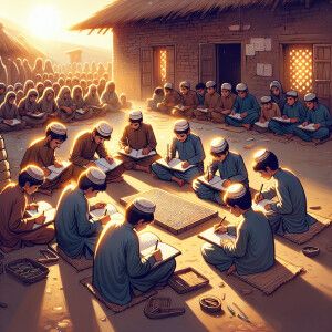 «Illustrate a scene depicting Pakistani village students diligent...»