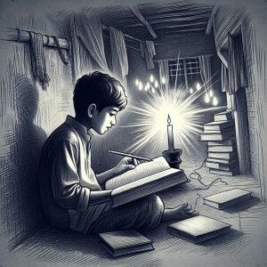 «Draw a sketch of Pakitani village student reading in light of ca...»