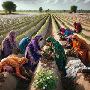 «Women villagers in Pakistan are carefully planting cotton seeds...»