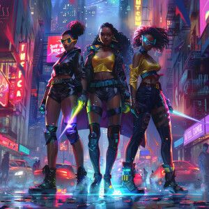 «Create a vivid scene featuring the superhero trio of Asha, Nia,...»