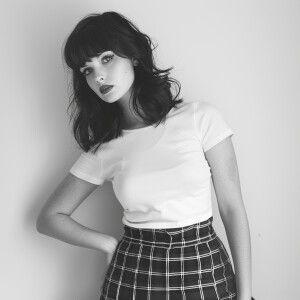 «Photo of fair skinned slightly curvy woman with dark hair, plaid...»