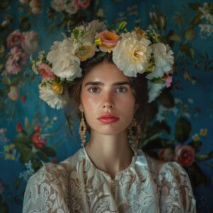 «A portrait of a stunning woman with flowers in her hair while ho...»