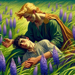 «Generate an image of Apollo holding Hyacinthos in his arms as is...»