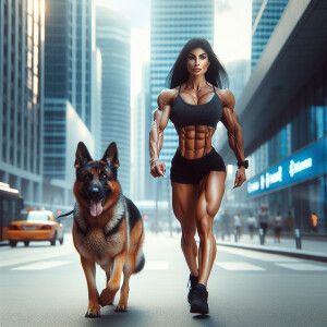 «A strong, muscular woman striding confidently through the bustli...»