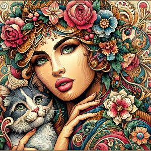 «Create an image of a stunning woman adorned with flowers in her...»