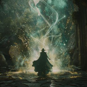 «A cinematic view of a female elf sorcerer casting spells, inspir...»