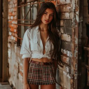 «Photo of long hair brunnette girl wearing short plaid skirt and...»