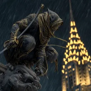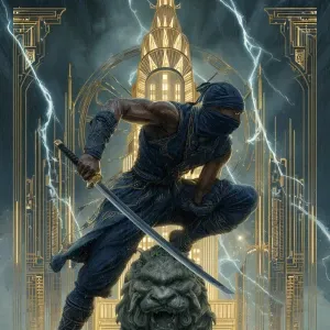 «A masked vigilante ninja in a crouching pose perched atop an ove...»
