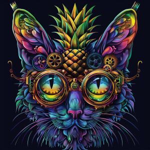 «Two cat faces designed in the shape of pineapples, each adorned...»
