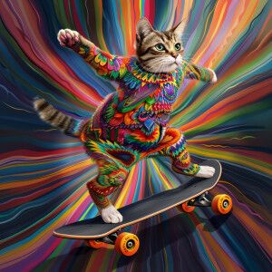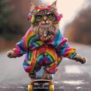 «A cat skateboarding in a vibrant hippie costume adorned with rai...»