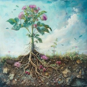 «Visualize the enchanting journey of a burdock root as it grows a...»