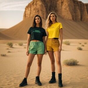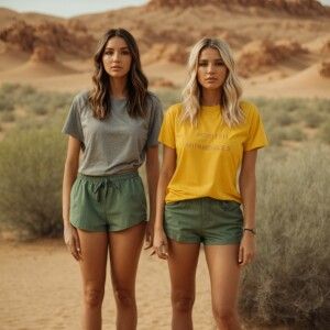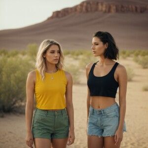 «Two beautiful, slender 23-year-old women stand side by side in t...»