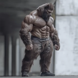 «The image depicts a very hairy muscular, ginger bearded man posi...»