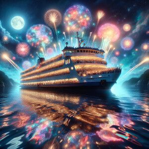 «Ferry on the bay with moonlit skies, the ferry is packed with pe...»