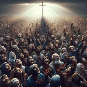 «huge crowd looking up and pointing to the cross. Some are happy...»