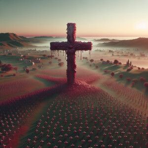 «a hige cross encapsulated inside a red heart in the sky. Show a...»