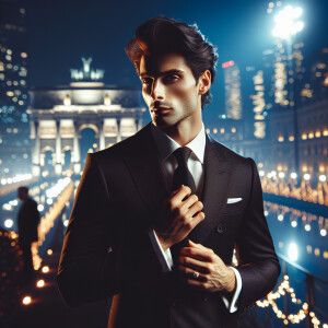 «An Italian male model with dark hair striking a pose in a styli...»
