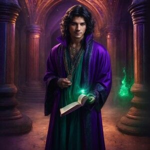 «In a secluded chamber, a charismatic young wizard stands proudly...»