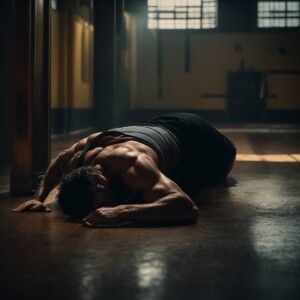 «Describe the image of a shirtless man lying on a wooden floor in...»