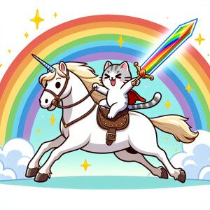 «A cartoon of a cat riding on a white horse with a rainbow sword,...»