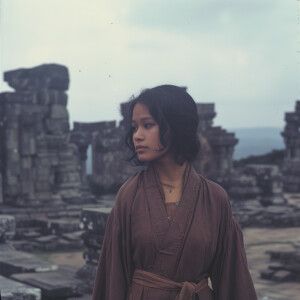 «A faded color film photograph from 1972 of a beautiful 23-year-o...»