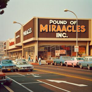«Color film photograph of a suburban strip mall in 1976. One of t...»