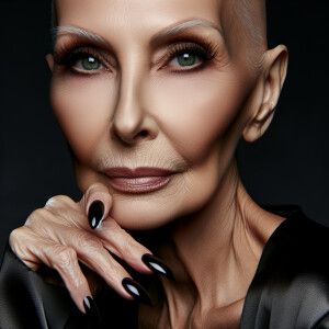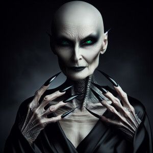«A pale skinned ,older,bald woman, with glowing green eyes, long...»