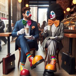 «Two Business Clown's sitting and drinking coffee at a popular co...»