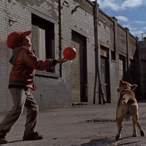 «DVD screen grab, 1980’s Cinema, kid is throwing a ball to a dog.»