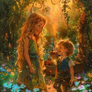 «Background: A whimsical garden at sunrise with luminescent flowe...»